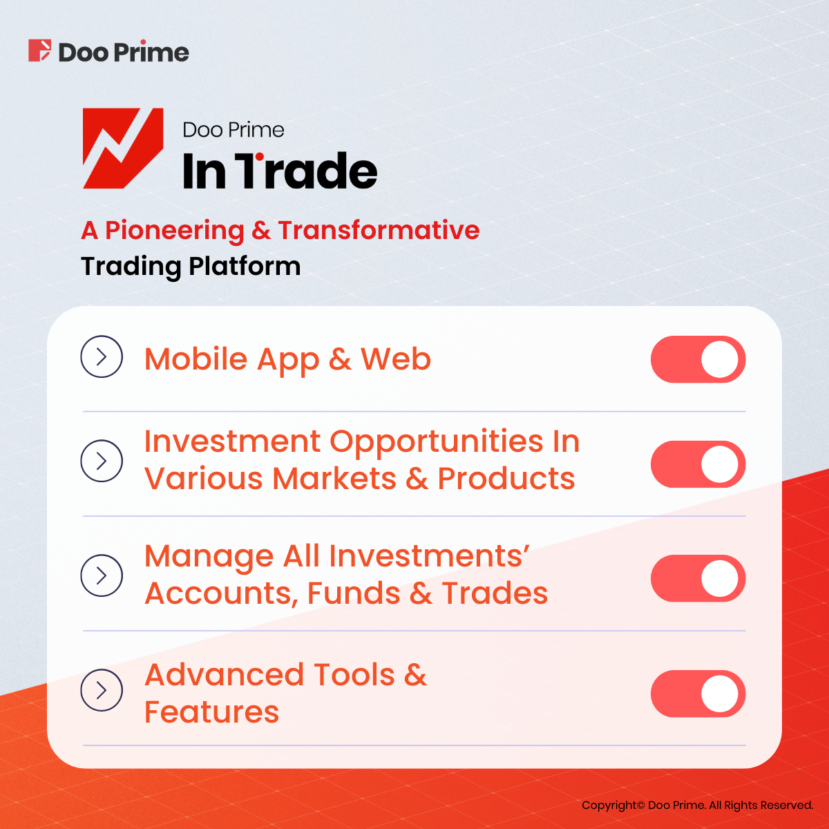 Analogously, Doo Prime InTrade is a pioneering and transformative trading platform that is proud to be a part of the fintech revolution. The Doo Prime InTrade mobile app and desktop version deliver investors with investment opportunities on various markets and products around the world with just one click.