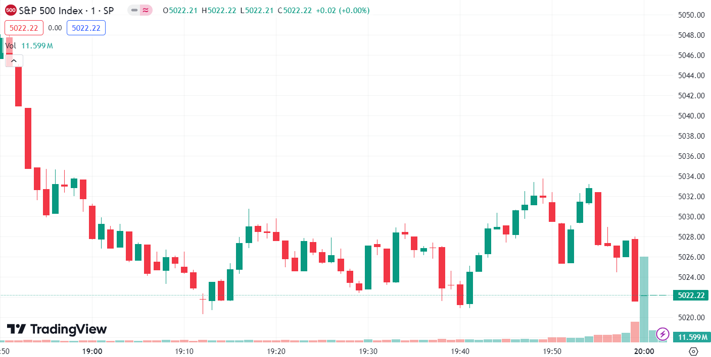 - S&P 500 fell 29.20 points or 0.58%, to 5,022.21.