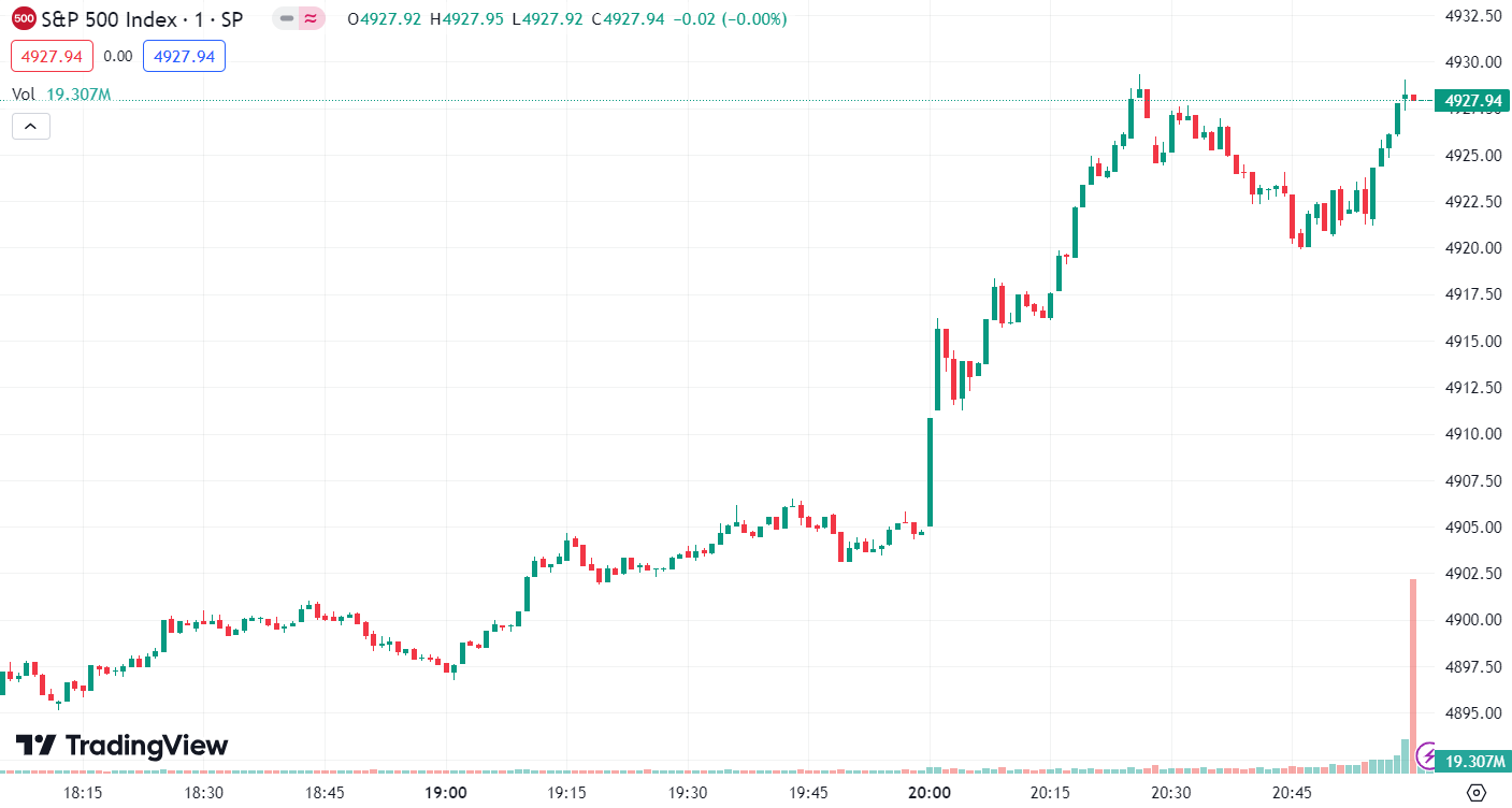 - S&P 500 Index rose by 36.96 points (0.76%) to 4,9270.93.
