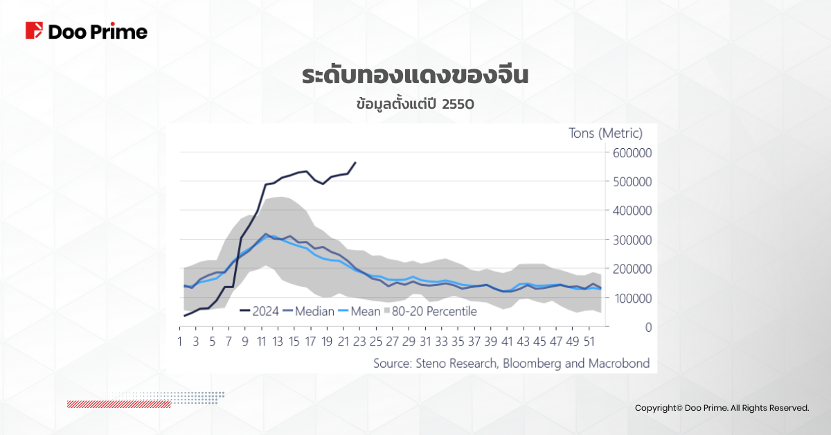 เมื่อพิจารณาถึงวิถีปัจจุบันและปัจจัยที่ขับเคลื่อนความต้องการ บทบาทและความเกี่ยวข้องของทองแดงคาดว่าจะเติบโตอย่างมีนัยสำคัญ โดยเฉพาะอย่างยิ่ง ระดับสต็อกทองแดงในปีนี้ของจีนเพิ่มขึ้นอย่างมาก เนื่องจากผู้มีส่วนได้ส่วนเสียสะสมปริมาณสำรองของทองแดงเพื่อคาดการณ์ความต้องการที่เพิ่มขึ้นและราคาที่อาจเพิ่มขึ้น แนวโน้มการกักตุนทองแดงนี้ ซึ่งแสดงผ่านกราฟล่าสุด บ่งชี้ถึงความเชื่อมั่นที่แข็งแกร่งในมูลค่าทองแดง