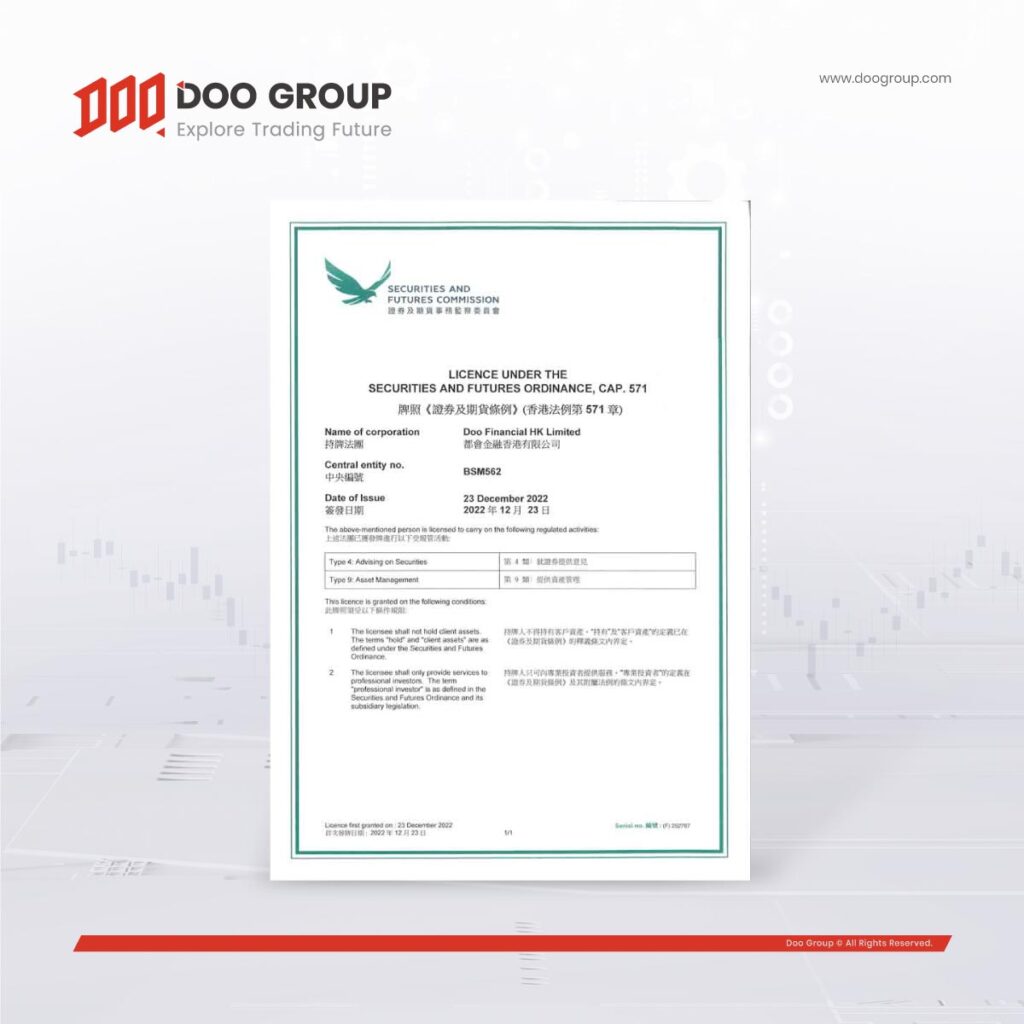 นับเป็นก้าวแห่งความสำเร็จอีกก้าวหนึ่ง เนื่องจาก Doo Financial HK Limited (CE No.: BSM562) ซึ่งเป็นบริษัทย่อยของ Doo Group ได้รับใบอนุญาตประเภทที่ 4 (ที่ปรึกษาด้านหลักทรัพย์) และประเภทที่ 9 (การจัดการทรัพย์สิน) (Central entity no.: BSM562) ที่ออกโดย Hong Kong Securities and Futures Commission (HK SFC)