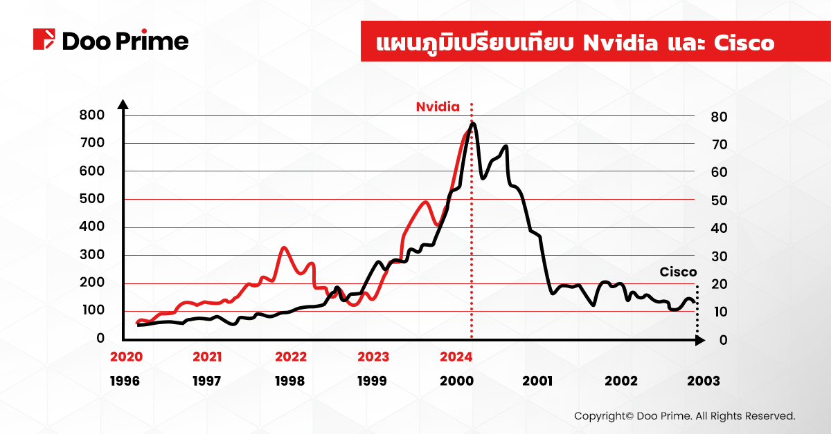 เพื่อให้บริบทเกี่ยวกับความเสี่ยงและผลตอบแทนที่อาจเกิดขึ้น การมองภาพให้สอดคล้องกับเหตุการณ์ทางประวัติศาสตร์ถือเป็นสิ่งสำคัญ การเปรียบเทียบกันระหว่างหุ้น Cisco ในช่วงวิกฤษดอทคอมในปี 2000 กับราคาในปัจจุบันของ Nvidia ทำหน้าที่เป็นเครื่องเตือนใจ เช่นเดียวกับ Nvidia ราคาของหุ้น Cisco ได้เพิ่มขึ้นอย่างรวดเร็วและตามมาด้วยแรงขายครั้งใหญ่ ข้อมูลอ้างอิงทางประวัติศาสตร์นี้ทำหน้าที่เป็นเครื่องเตือนใจ โดยกระตุ้นให้นักลงทุนระมัดระวังกับการขึ้นของราคา Nvidia ในครั้งนี้