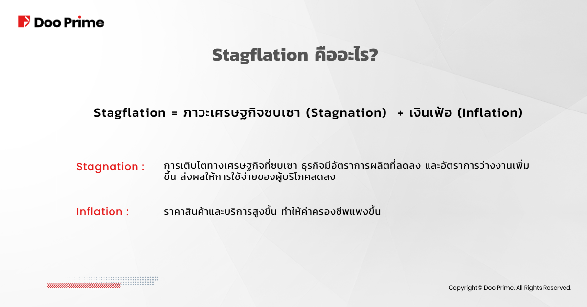 คำว่า “Stagflation” เป็นคำผสมระหว่าง “การเติบโตของเศรษฐกิจที่ซบเซา (Stagnation)” และ “เงินเฟ้อ (Inflation)” ซึ่งเป็นสถานการณ์ทางเศรษฐกิจที่ท้าทายอย่างมาก