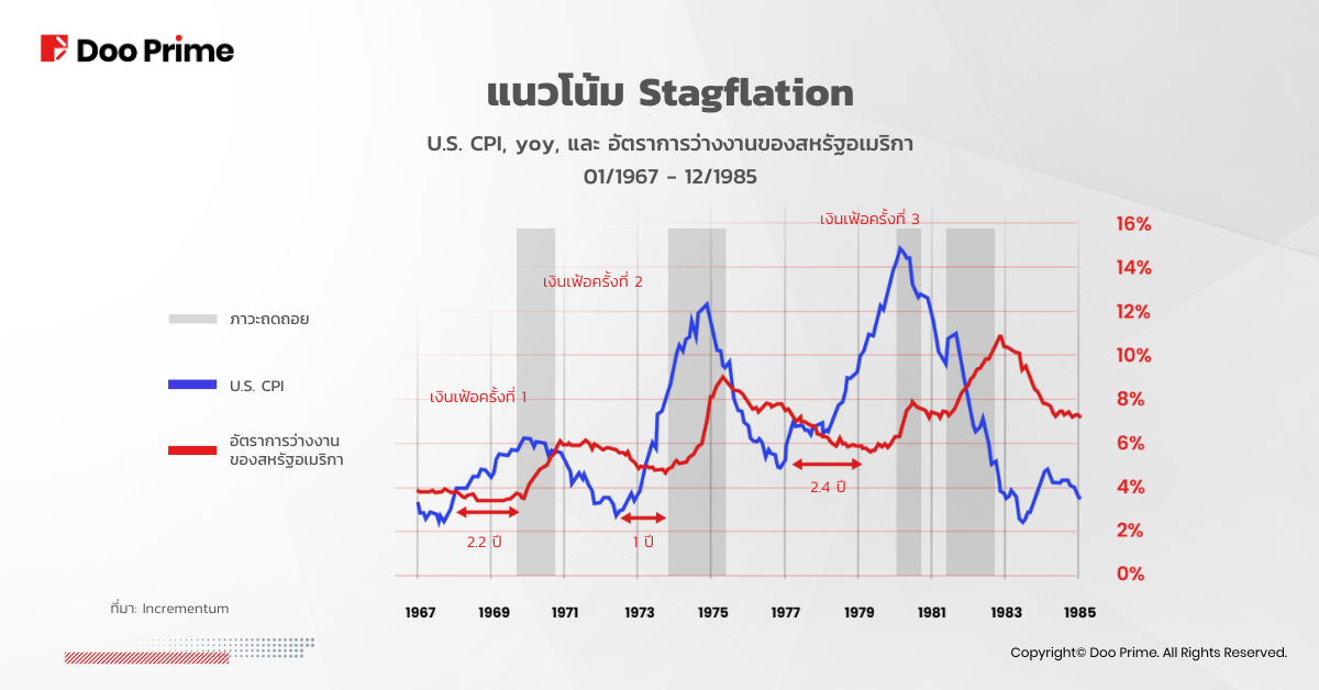 เมื่อลองมองย้อนกลับไปดูช่วงเวลา Stagflation ในอดีต เช่น Stagflation ในช่วงทศวรรษ 1970 ช่วงนั้นเป็นตัวอย่างที่สำคัญของสภาวะ Stagflation โดยมี “3 คลื่น” ที่มองเห็นได้อย่างชัดเจน ซึ่งแต่ละคลื่นมีลักษณะเฉพาะของตัวเอง การวิเคราะห์คลื่นในอดีตเหล่านี้สามารถให้ข้อมูลเชิงลึกได้ดังที่แสดงในกราฟต่อไปนี้