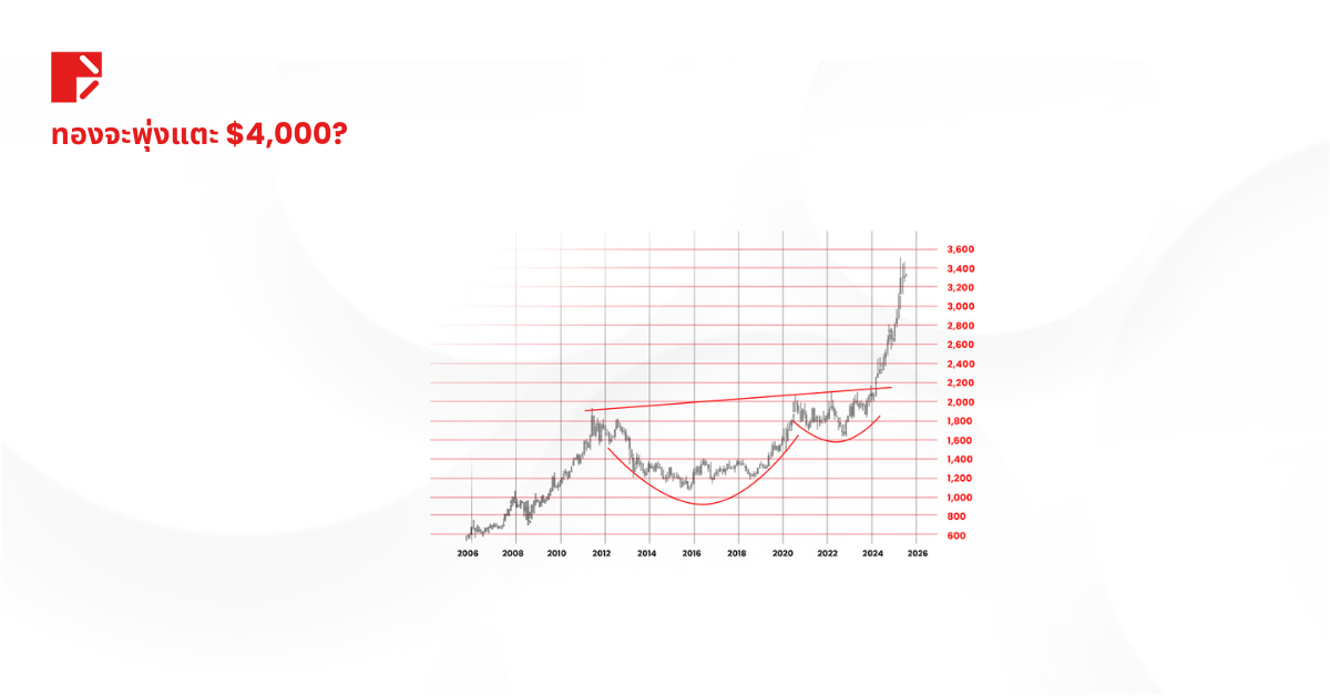 หากคุณลองดูปัจจัยทางเทคนิค จะเห็นว่าทองคำกำลังเข้าสู่ช่วงสะสมครั้งใหญ่เหนือระดับ 3,500 ดอลลาร์ รูปแบบนี้เริ่มก่อตัวมาตั้งแต่ช่วงปี 2011 ด้วยรูปแบบ “ถ้วยและด้ามจับ” ระยะยาว หากแพทเทิร์นนี้ยังคงดำเนินต่อไป ก็มีโอกาสสูงที่ราคาทองจะทดสอบระดับ 4,000 ดอลลาร์ และอาจไปไกลกว่านั้น