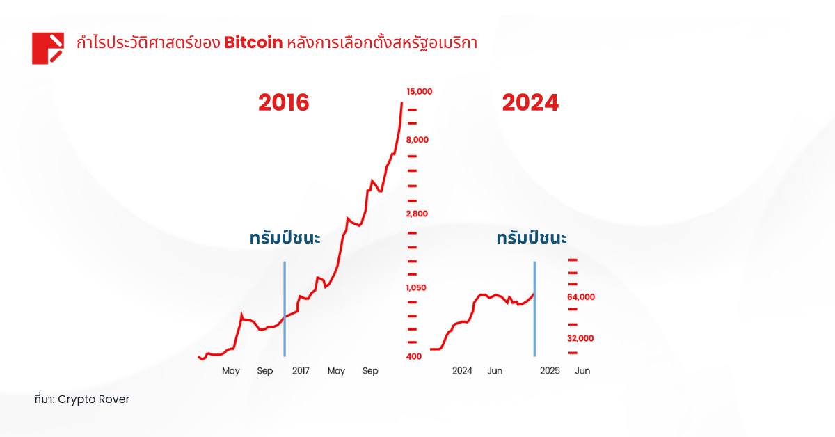 จากสถิติที่ผ่านมา บิทคอยน์แสดงการเติบโตที่สำคัญหลังการเลือกตั้งประธานาธิบดีสหรัฐฯ โดยเฉพาะอย่างยิ่งภายใต้ผู้นำที่สนับสนุนธุรกิจอย่างทรัมป์ ในปี 2016 หลังจากที่ทรัมป์ชนะการเลือกตั้งครั้งแรก ราคาบิทคอยน์พุ่งจากประมาณ 700 ดอลลาร์สหรัฐ ไปเกิน 10,000 ดอลลาร์สหรัฐ ภายในหนึ่งปี ดังที่เห็นได้ในกราฟด้านบน