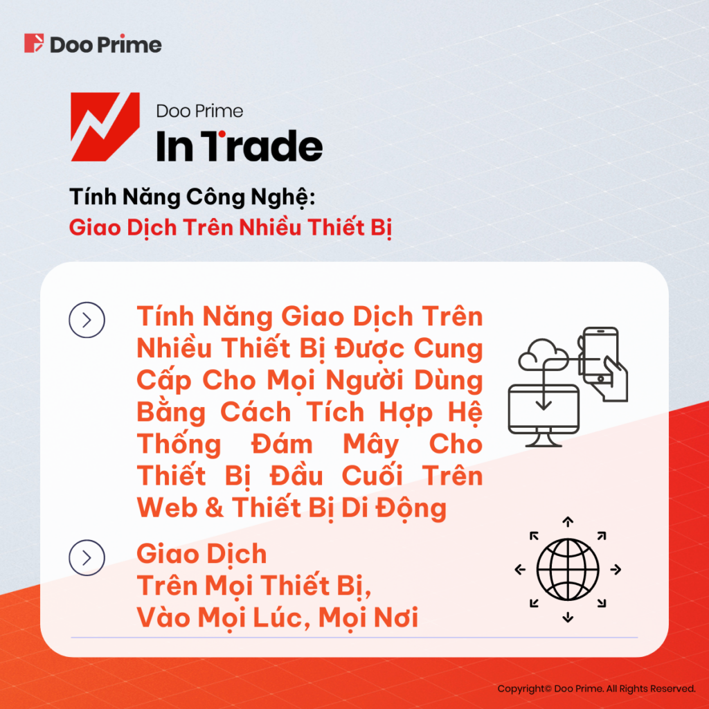 Trên Doo Prime InTrade, tính năng giao dịch trên nhiều thiết bị được cung cấp cho tất cả người dùng bằng cách tích hợp hệ thống đám mây cho cả thiết bị đầu cuối trên website và thiết bị di động.