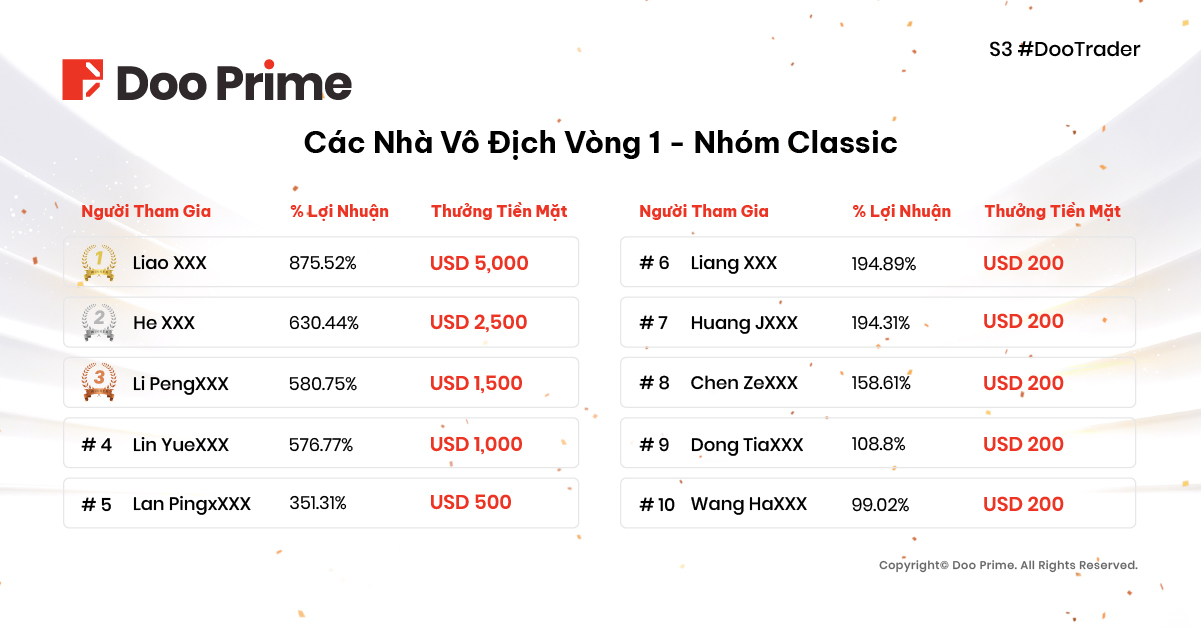 Chúc Mừng Các Nhà Vô Địch Vòng 1 – Cúp Giao Dịch Toàn Cầu #DooTrader Mùa 3