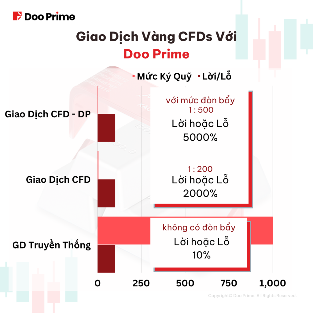 Tại Doo Prime, chúng tôi cung cấp mức đòn bẩy linh hoạt lên đến 1:500. Điều này cho phép quý khách hàng dễ dàng tăng tối đa chi phí đầu tư. Đòn bẩy mang lại lợi nhuận cao hơn với mức vốn bỏ ra thấp hơn, tuy nhiên cũng đi kèm với những rủi ro liên quan đến mức thua lỗ lớn. Chính vì thế, bạn nên hết sức lưu ý khi tiến hành đặt lệnh.