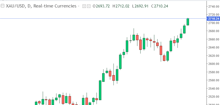 Giá vàng giao ngay tăng 0.4% lên mức cao kỷ lục là 2,705.26 USD/ounce, trong khi giá vàng hợp đồng tương lai đáo hạn vào tháng 12 tăng 0.5% lên 2,720.15 USD/ounce. Vàng đã gia tăng ngay cả khi doanh số bán lẻ và dữ liệu thị trường lao động của Mỹ mạnh mẽ đã làm gia tăng dự đoán rằng lãi suất Mỹ sẽ giảm với tốc độ chậm hơn trong những tháng tới.